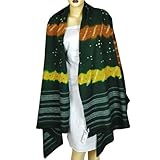 Tie dye shawls of ShalinIndia come from Kutch region of Gujarat. These shawls are made of rough wool. The main colors used in the tie dye of this region are yellow, green, red and back - lighter colors are always dyed before the darker ones. The cloth may be the finest silk (the best tie dye is done on silk, for the weddings of the Khatri dyers' own daughters) or rough wool, but usually it is very permeable muslin which is folded in four before the tying process commences. This is supervised by the head of the family, but all the members, including the women and children, are involved. Those who actually tie the cloth grow a long nail on the little finger of the left hand, or wear a ring with a little blunt spike on it, with which they push the layers of cloth upwards from underneath to form a tiny peak. Some details of coloring are spot dyed: yellow dots are often daubed with blue to make green, for example. Dyers in Kutch and Saurashtra commonly work with three or four different dye baths. The workers of Saurashtra origin generally produce patterns of fine spiraling dots in a single color on a deep red ground..../ Tie & Dye Shawl Wrap in Wool Fabric 80 " x 35 " / Formal Wrap